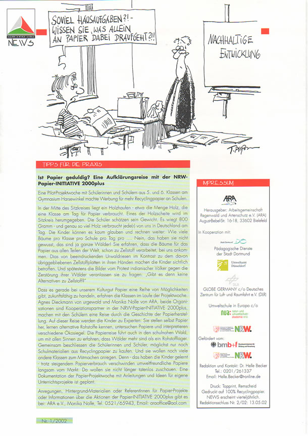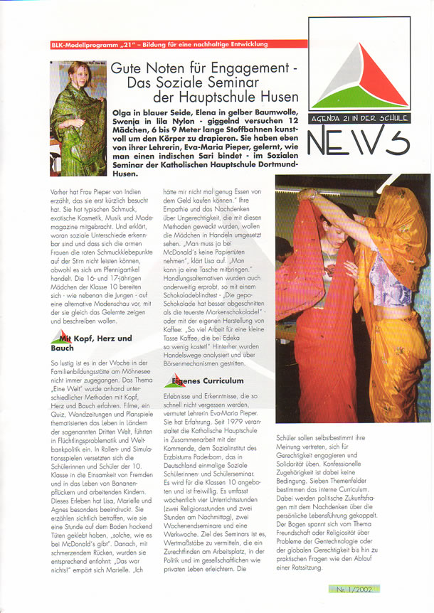 21 in der Schule BLK-Modellprogramm "21" - Bildung für eine nachhaltige Entwicklung NRW-Programmteil 9. Newsletter: Nr. 1 / 2002 (Februar 2002) |