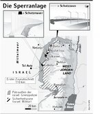 Sperranlage im Westjordanland In die Landkarte ist der Verlauf der geplanten und z.T. schon erbauten Sperranlagen im Westjordanland eingetragen. Die Sperranlagen sind teils als stark bewerter Grenzzaun, teils als mehrere Meter hohe Betonmauer ausgelegt. Trotz internationalen Protests und einer UN-Resolution betreibt Israel den weiteren Ausbau der Sperranlagen, die nach Angaben Israels zum Schutz vor terroristischen Anschlägen dienen sollen. Die Grafik ist eingebettet in den Artikel: "Israel beharrt auf der Mauer gegen die Angst.Trotz der Resolution der UN-Vollversammlung werden Palästinenser-Dörfer weiter abgeriegelt" [FR, 23.10.03] |