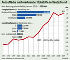 FR-Grafik: Anbauflächen nachwachsender Rohstoffe (Nawaro) in Deutschland Die rote Kurve zeigt den Anstieg der Anbauflächen mit nachwachsenden Rohstoffen (in 1000 Hektar (kha)) von ca. 500 im Jahr 1997 auf 2000 in 2009, darunter: Energiepflanzen: Biodiesel/Pflanzenöl 942; Biogas 530; Bioethanol 226. Industriepflanzen: Öl 131; Stärke 130; Zucker 22; Heil-/Farbstoffe 10; Fasern 1. Die Grafik ist eingelinkt im Artikel: Mais, Mais und nochmal Mais [FR 6.2.10]