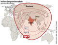FR-Grafik: Reichweiten von Indiens Langstreckenraketen Am 19.4.12 hat Indien erfolgreich die neue atomwaffenfähige Langstreckenrakete "Agni V" getestet. Mit einer Reichweite von 5000 km erfasst sie auch alle Großstädte in China. Experten gehen daher davon aus, dass die neue Langstreckenrakete vor allem zur Abschreckung und Eindämmung von China dienen soll, was sich einreiht in die Asienstrategie der USA, die Indien nicht zuletzt deswegen als Atommacht akzeptierte, obwohl Indien bisher den Atomwaffensperrvertrag nicht unterzeichnet hat. Kritiker wenden u.a.ein, dass die immensen Aufwendungen für das Atomprogramm besser in die Entwicklung des immer noch von krasser Armut und Ungleichheit geprägten Landes investiert werden sollten. Die Grafik ist abgedruckt im Artikel: 50 Tonnen indisches Selbstbewusstsein [FR 20.04.12]