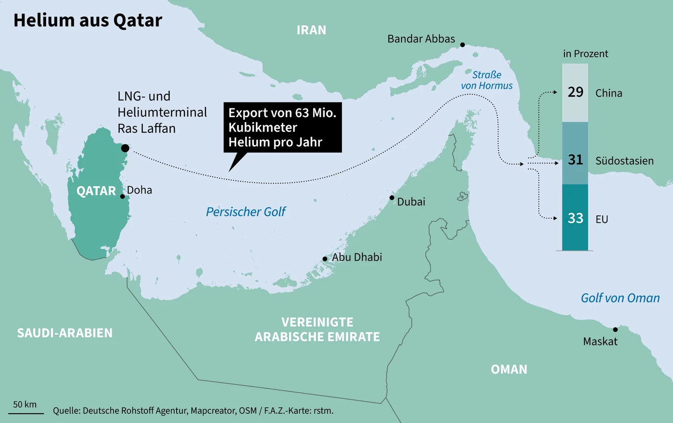 Die Lieferketten sind schon gestört Im Krieg am Golf sind mehr als 40 Energieanlagen getroffen worden. Die Folgen sind dramatisch, denn es geht nicht nur um Öl und Gas. Vier Grafiken zeigen die Bedeutsamkeit von Helium. LK(Golfregion: Helium aus Katar) IG(Helium: Verwendung; Produktion; Ressourcen); zum externen Volltext