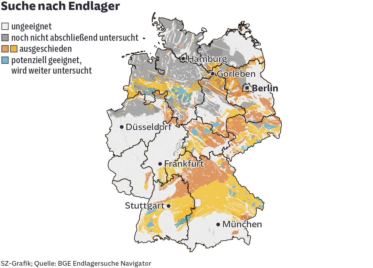 Auswahl für Endlager schrumpft weiter Auf der Suche nach dem bestmöglichen Ort für Deutschlands Atommüll haben Geologen weitere Regionen ausgeschlossen. Für andere dagegen wird die Sache konkreter – auch in Bayern. LK(Deutschlandkarte Endlagersuche) zum externen Volltext